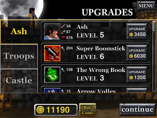 Tra le diverse tipologie di castle defense esistenti, quella che più si avvicina al gameplay di Army of Darkness Defense è Plants vs Zombies. Del capolavoro PopCap Games riprende la visuale e la possibilità di scegliere solo alcune delle truppe disponibili e dei poteri esistenti all’inizio di ogni livello, scelta che andrebbe effettuata in relazione alle unità nemiche che ci troveremo ad affrontare. Tuttavia le nostre unità, Ash per primo, si potranno muovere, avanzando verso il nemico o indietreggiando in caso di pericolo. La produzione di unità richiede metalli, raccolto dai nemici uccisi, insieme alle monete con cui comprare upgrades per noi, per l’esercito o per le difese del castello e del Necronomicon.