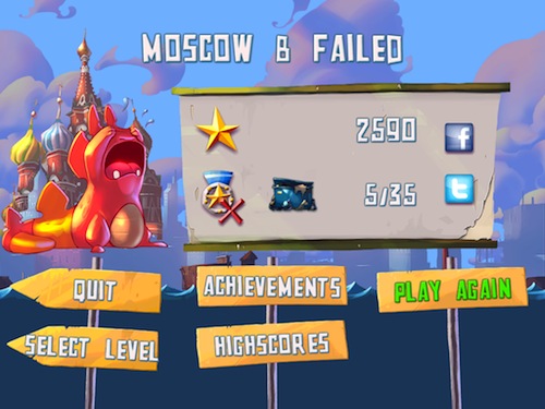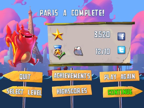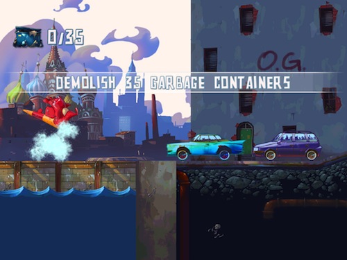 Tuttavia, ogni livello ha un obbiettivo secondario, di solito si tratta di raggiungere un determinato punteggio o distruggere almeno un certo numero di oggetti. Al completamento dell’obbiettivo primario sarà possibile decidere se rigiocare il livello cercando di migliorare il punteggio o, nel caso in cui non ci fossimo riusciti, di raggiungere anche l’obbiettivo secondario, oppure andare avanti e continuare la nostra folle corsa. Esiste poi la possibilità sbloccare particolari obbiettivi o di condividere i nostri punteggi attraverso Game Center, Facebook e Twitter.