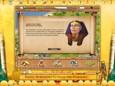 30 livelli nei quali incontreremo 10 faraoni, numerosi edifici, nuovi progetti da sbloccare, supporto a Game Center e un mini gioco, sono le caratteristiche di questo titolo, compatibile con iPad e iOS 3.2 o successivo, attualmente in vendita a 1,59 euro