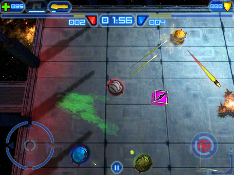 Per adeguare il sistema di controllo al multitouch troviamo una levetta analogica virtuale in basso sulla sinistra, con la quale gestiremo il movimento. Dall’altra parte soltanto un tasto per sparare, la mira è automatica. Sotto quest’aspetto tutto funziona molto bene ma c’è da segnalare la distanza eccessiva del selettore per l’arma: si trova esattamente dall’altra parte dello schermo, in alto, una posizione davvero scomoda specialmente su iPad.