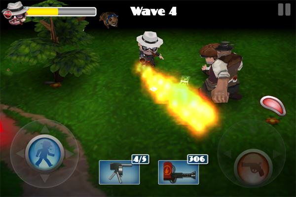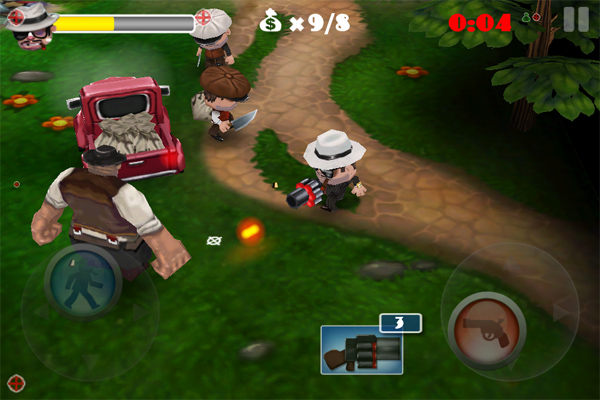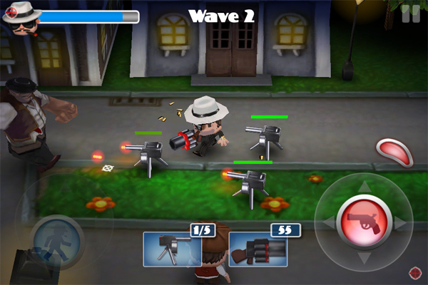 Non c’è molto da dire sul sistema di controllo, ormai i giochi del genere si sono adeguati allo standard della doppia levetta virtuale che in effetti funziona bene ed è una soluzione comoda. Devo dire però che ho riscontrato un bug nel gioco, che può essere molto fastidioso nella modalità Attack: sparando ad una cassa per raccogliere la dinamite, quest’ultima può spingersi al di fuori della parte “calpestabile” dello scenario rendendosi impossibile da raccogliere e quindi è impossibile terminare il livello. Speriamo in un bugfix veloce.