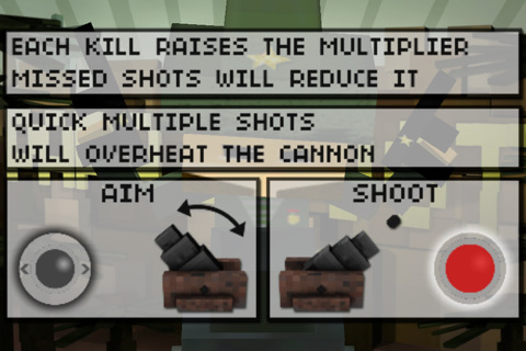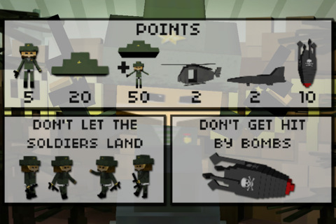 Due semplici pulsanti, uno per direzionare lo sparo e uno per fare fuoco. Più nemici riusciremo a colpire più il punteggio potrà essere alto. Colpire tanti nemici di seguito farà alzare il moltiplicatore di punteggio, che tornerà ad 1 al primo proiettile sprecato. Attenzione a non far atterrare i soldati e soprattutto attenzione alle bombe!