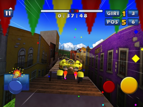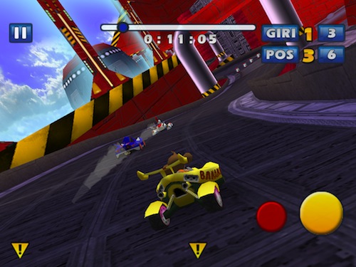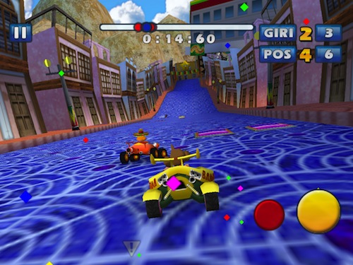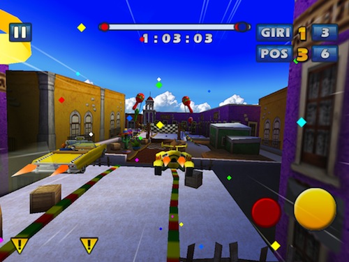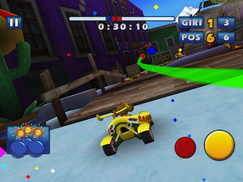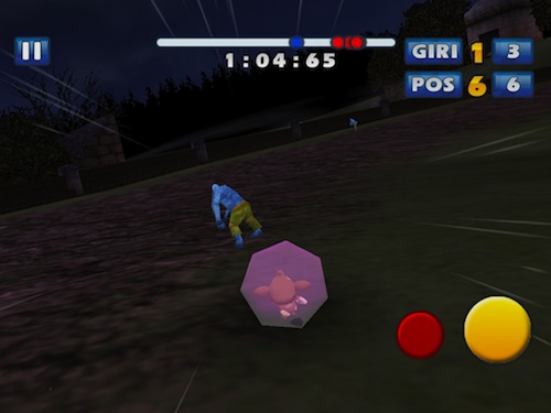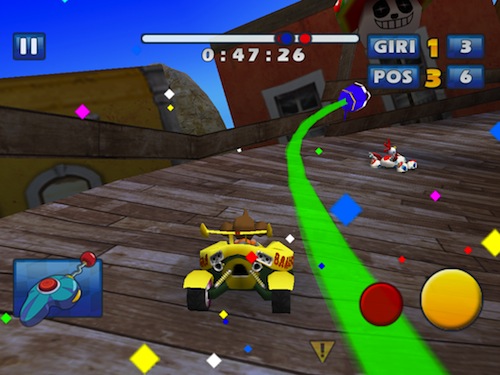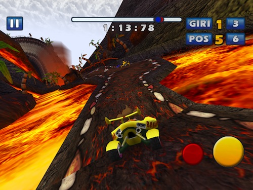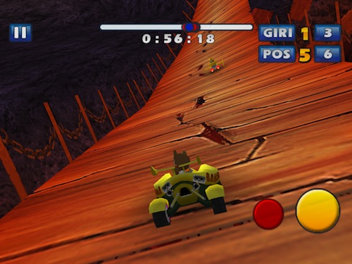 Controllare il nostro veicolo sarà abbastanza semplice, anche sull’ampio display di iPad, principalmente perché l’accelerazione è automatica, pertanto dovremo concentrarci quasi esclisivamente sull’uso dell’accelerometro per sterzare ed evitare i vari ostacoli che ci troveremo davanti. Sono comunque presenti due pulsanti in basso a destra, uno giallo che permette di frenare e quindi di derapare ed uno rosso che useremo davvero poco, a meno che non sia davvero una giornata storta, col quale attivare la retromarcia.