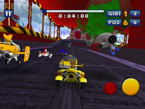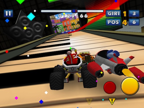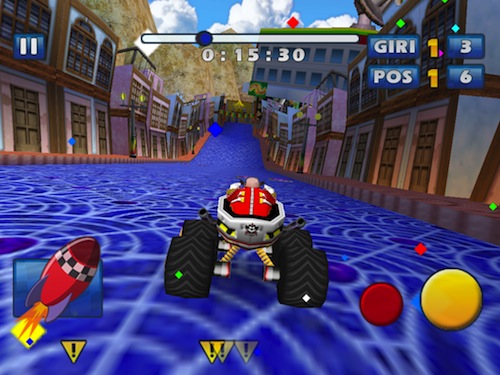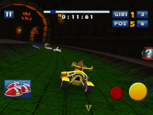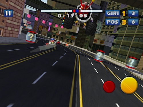 C’è poi un terzo pulsante, in basso a sinistra, che compare solo quando raccogliamo una capsula e che indica il power up che abbiamo ottenuto, può trattarsi di un breve sprint, rappresentato dalle scarpette di Sonic o i varie armi da sfruttare per raggiungere chi ci precede o per seminare chi ci segue, come missili, mine, arcobaleni che riducono la visuale e non solo.