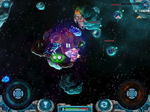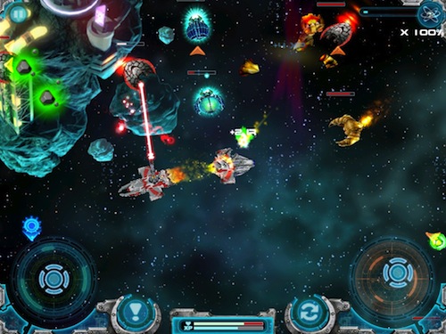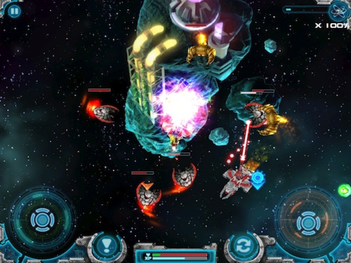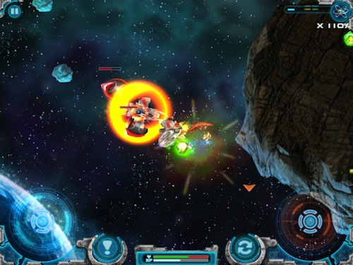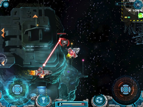 Come anticipato il sistema di controllo della nostra navicella è molto simile a quello di Gun Bros, che poi è chiaramente ispirato a quello degli sparatutto per console. Due pad virtuali, quello di sinistra farà muovere la nave, mentre quello di destra controllerà le armi. Nessun tasto per sparare, il fuoco sarà ininterrotto attivato dal semplice tocco sul pad di destra.