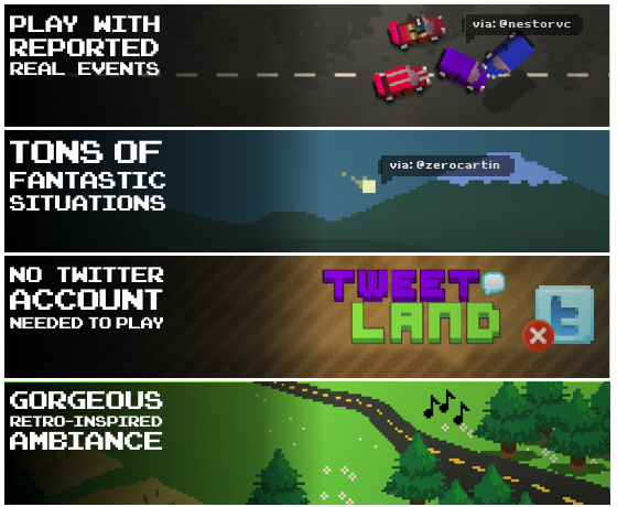 Come funzionerà Tweetland? È tutto molto semplice. Ogni volta che qualcuno – nel mondo reale – pubblicherà un commento su Twitter, ciò determinerà un determinato avvenimento nel gioco, sviluppato per riconoscere una vasta serie di parole chiave: l’auto nel gioco di corsa potrebbe andare fuori pista, il fucile nello sparatutto potrebbe ricaricarsi, e così via. Il team promette di aver considerato un numero davvero grandissimo di parole chiave e di rispettivi eventi (tra cui “meteore, tsunami, spada laser, eruzione vulcanica”) e di averne in serbo molti altri. L’esperienza di gioco, grazie all’imprevedibilità dei commenti, sarà così continuamente diversa ed irripetibile.