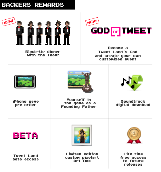 L’idea di Tweetland è certamente originalissima, così come quella di autofinanziare il progetto promettendo in cambio, spiritosamente, anche una cena in giacca e cravatta col team a chi donerà più di settecento bigliettoni. Per il momento, mancano circa duemila dollari per raggiungere il goal.